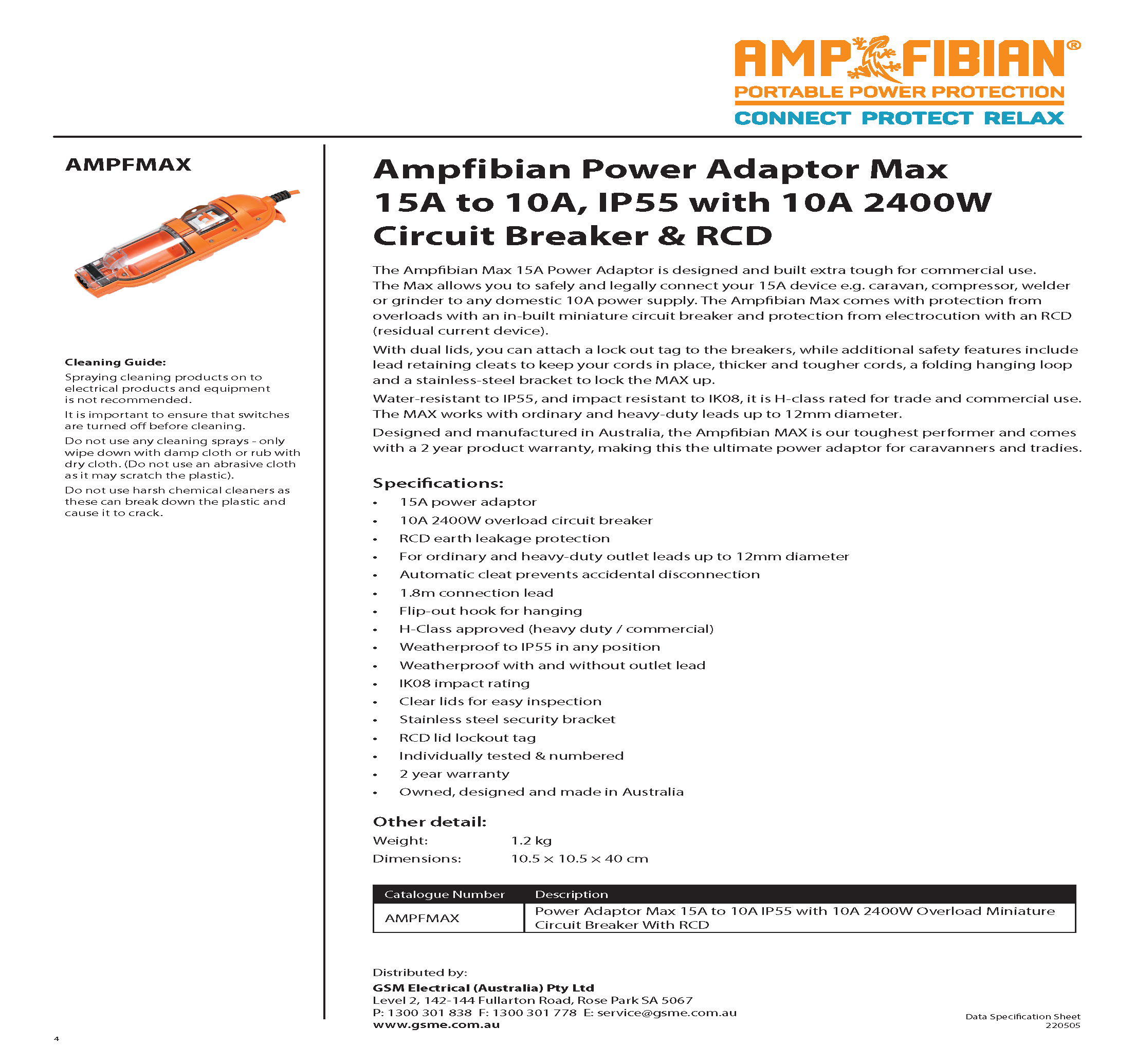 - The Ampfibian Max 15A Power Adaptor is designed and built extra tough for commercial use. The Max allows you to safely and legally connect your 15A device e.g. caravan, compressor, welder or grinder to any domestic 10A power supply. The Ampfibian Max comes with protection from overloads with an in-built miniature circuit breaker and protection from electrocution with an RCD (residual current device). With dual lids, you can attach a lock out tag to the breakers, while additional safety features include lead retaining cleats to keep your cords in place, thicker and tougher cords, a folding hanging loop and a stainless-steel bracket to lock the MAX up. Water-resistant to IP55, and impact resistant to IK08, it is H-class rated for trade and commercial use. (-) The MAX works with ordinary and heavy-duty leads up to 12mm diameter. Designed and manufactured in Australia, the Ampfibian MAX is our toughest performer and comes with a 2 year product warranty, making this the ultimate power adaptor for caravanners and tradies.