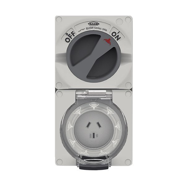 - Buffalo offers an extensive range of IP66 rated Combination Switched Sockets that are available in three-pin 10A to 32A, four-pin 10A to 50A and five-pin 10A to 50A designs. Phase links are factory fitted between switches and sockets. Small Single phase Flat pin - 10A to 20A Size 1 Single & Three Phase - 10A- 20A Size 2 Single & Three Phase - 32A - 50A Heavy Duty terminals are standard on all products with Double Pole switching option as standard on 3 pin products. The combination switch handle has two padlocking facilities (Oval Shape 11 x 9mm) so equipment can be safely isolated. Switch is provided with LED fitment option (not supplied). Combination sockets feature a clear dustproof & hoseproof flap allowing simple viewing of sockets. The flap is also provided with a reliable spring-tensioned latch to keep dust & liquids out. Part bag contains twin screwed connector.-