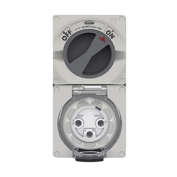 - Buffalo offers an extensive range of IP66 rated Combination Switched Sockets that are available in three-pin 10A to 32A, four-pin 10A to 50A and five-pin 10A to 50A designs. Phase links are factory fitted between switches and sockets. Small Single phase Flat pin - 10A to 20A Size 1 Single & Three Phase - 10A- 20A Size 2 Single & Three Phase - 32A - 50A Heavy Duty terminals are standard on all products with Double Pole switching option as standard on 3 pin products. The combination switch handle has two padlocking facilities (Oval Shape 11 x 9mm) so equipment can be safely isolated. Switch is provided with LED fitment option (not supplied). Combination sockets feature a clear dustproof & hoseproof flap allowing simple viewing of sockets. The flap is also provided with a reliable spring-tensioned latch to keep dust & liquids out. Part bag contains twin screwed connector.-