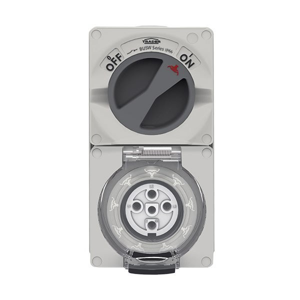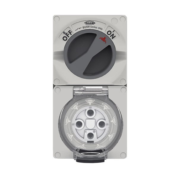 - Buffalo offers an extensive range of IP66 rated Combination Switched Sockets that are available in three-pin 10A to 32A, four-pin 10A to 50A and five-pin 10A to 50A designs. Phase links are factory fitted between switches and sockets. Small Single phase Flat pin - 10A to 20A Size 1 Single & Three Phase - 10A- 20A Size 2 Single & Three Phase - 32A - 50A Heavy Duty terminals are standard on all products with Double Pole switching option as standard on 3 pin products. The combination switch handle has two padlocking facilities (Oval Shape 11 x 9mm) so equipment can be safely isolated. Switch is provided with LED fitment option (not supplied). Combination sockets feature a clear dustproof & hoseproof flap allowing simple viewing of sockets. The flap is also provided with a reliable spring-tensioned latch to keep dust & liquids out. Part bag contains twin screwed connector.-