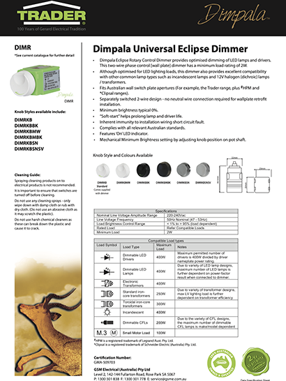 - DIMPR is suitable for use with Australian wall plate apertures including Trader, HPM# & Clipsal*.