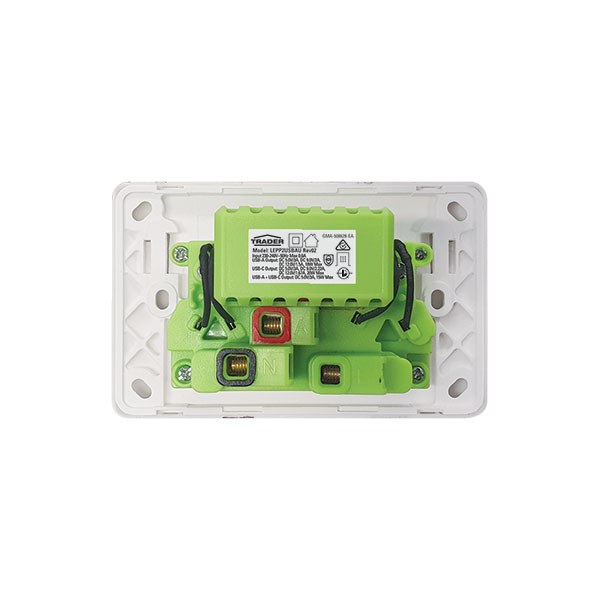 - The USB circuit is integrated with the socket outlet and connected internally so only one set of terminals are required for the electrician to wire the device.